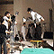 4種類×4人で16シーンを撮影するのだが、これがなかなかタイヘン。ぽーんっと飛んでカキワリのちょうど前でポーズが決まっているうえに、表情もよくてはならないのだ。最初は勢い余って…あら? ISSAは髪の毛だけ? SHINOBUは後ろ向き?、YUKINARIは足だけ〜? KENはどこいっちゃったのー?なんてことが続出。なかなか1回でOKは出ませんでした。