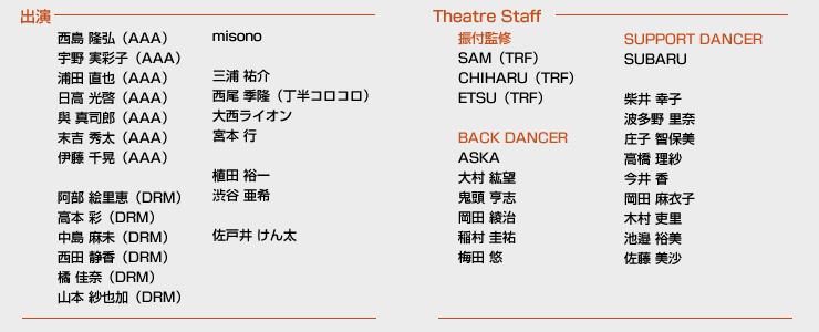 また振り付けにTRFメンバー(SAM/CHIHARU/ETSU)を迎えるなど、ミュージカルの枠組みを越えたドラマあり/LIVEあり/ダンスありの一大エンタテインメントに仕上がった魅力的な作品。