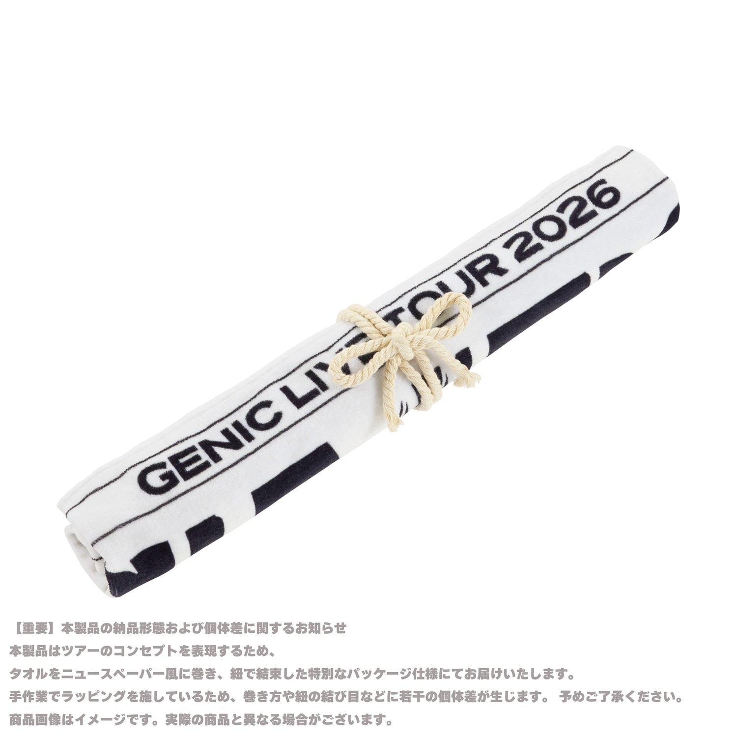本製品はツアーのコンセプトを表現するため、タオルをニュースペーパー風に巻き、紐で結束した特別なパッケージ仕様にてお届けいたします!