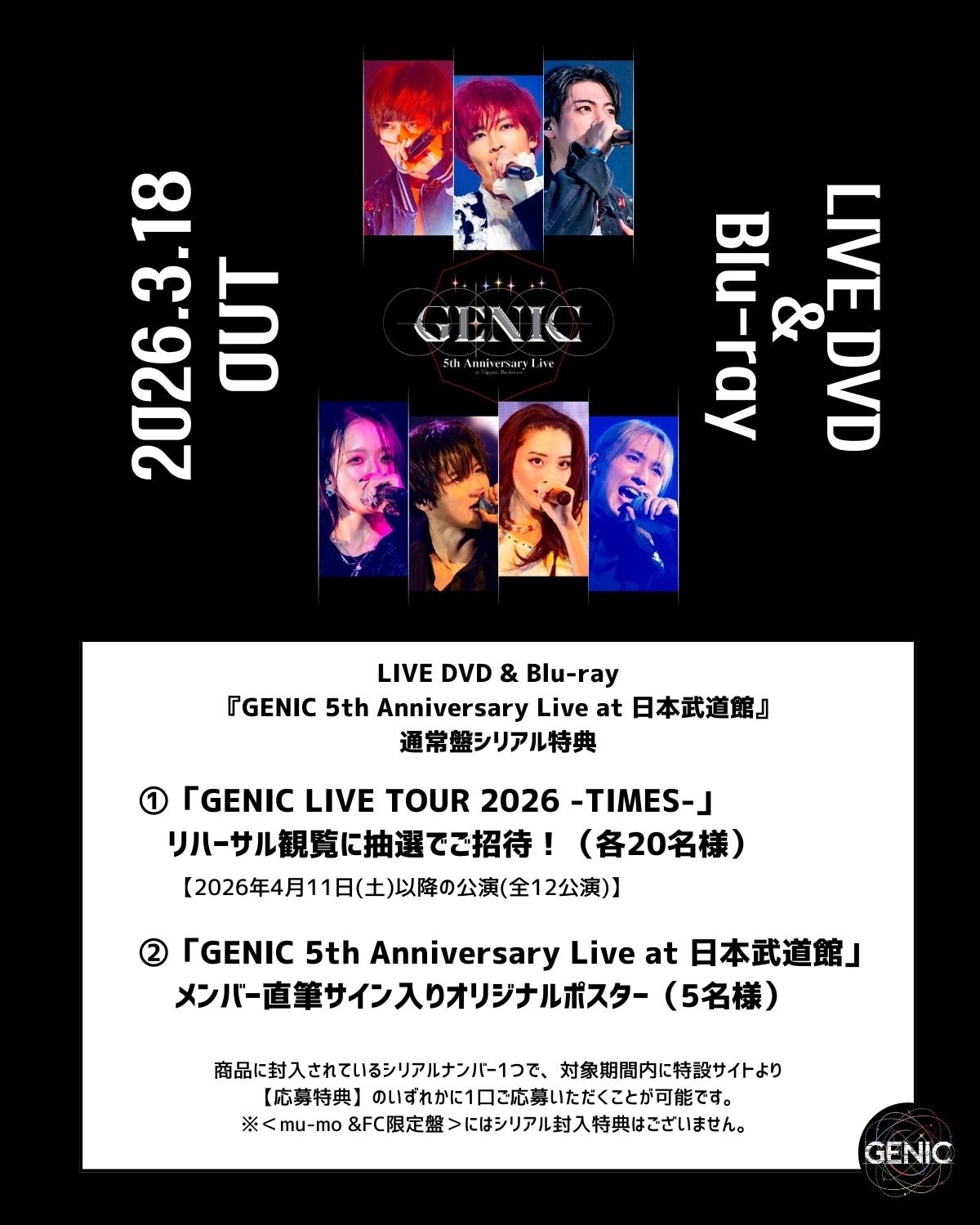 2026年3月18日(水)発売のLIVE DVD & Blu-ray『GENIC 5th Anniversary Live at 日本武道館』【通常盤】に封入されている