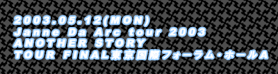 | 『オマエ、5/12のツアーファイナルから何日経ってると思っとるんじゃぁー、ボケェ!!』なんて声を遠くに聴きながら、やっと今夜パソコンに向かって打つべし!打つべし!!なんてしようと思ったら、6/12の深夜1時45分。ちょうどアノ日から1カ月。大概、コレって書き終わった後に後悔するんですよね、写真だけにしとけば良かったって、、、、。 |