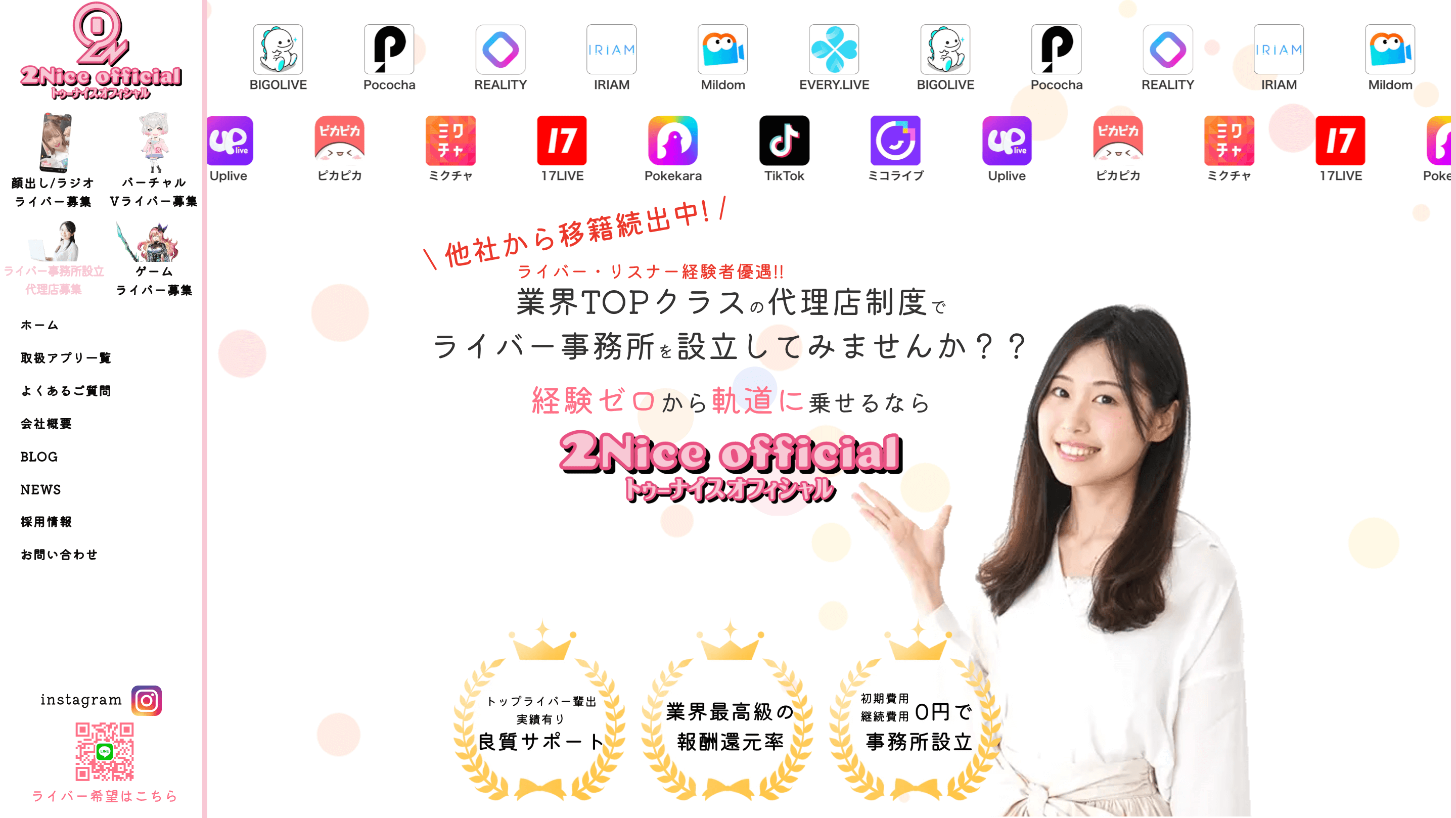2Nice officialが募集している代理店は、初期費用0円ではじめられます。配信アプリの規則や基礎知識は資料を用意しており、初心者でも問題なく運営できるようサポートしています。