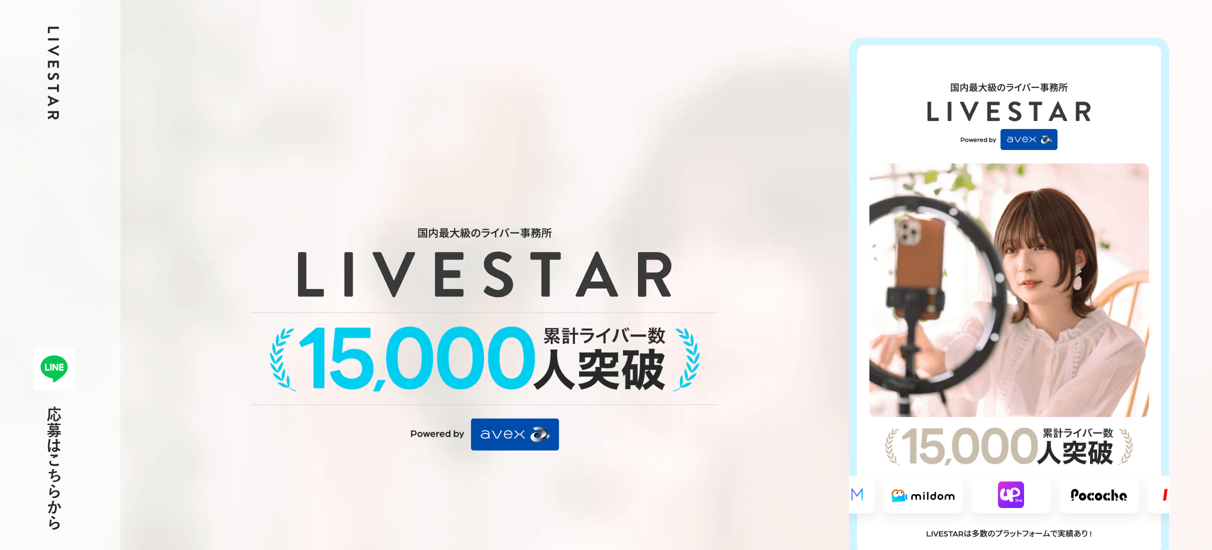 ライブスターはavex(エイベックス)の公式ライブ配信事務所として圧倒的なブランド力で、15,000人以上がライバーとして在籍している日本最大級のライブ配信事務所です。プラットフォームもポコチャやイチナナライブといった配信媒体だけでなく、Vtuber配信も可能なイリアムなども連携しており、幅広いライバーが自分の夢を追いかけながら日々活躍しています。