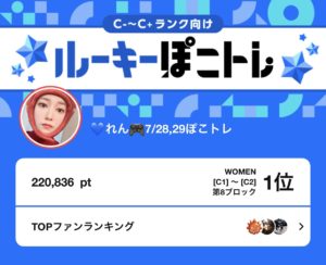 弊社所属ライバーのれんがPococha主催イベント「ルーキーぽこトレ」C1~C2にて1位に入賞いたしました。