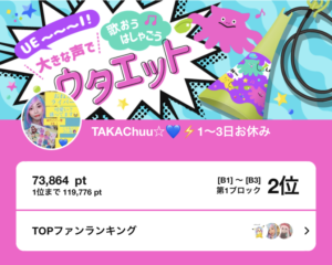 弊社所属ライバーのTAKAChuu☆がPococha主催イベント「うぇ~~~い!大きな声で 歌おう はしゃごう ウタエット」B1~B3の第1ブロックにて2位に入賞いたしました。