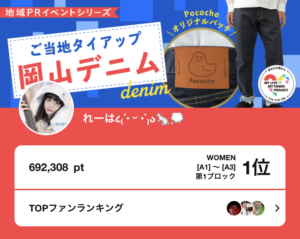 弊社所属ライバーのれーはがPococha主催イベント「地域PRイベントシリーズ ご当地タイアップ 岡山デニム」A1~A3の第1ブロックにて1位に入賞いたしました。