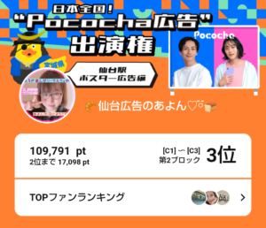 弊社所属ライバーのあよん♡がPococha主催イベント「日本全国 Pococha広告出演権 仙台駅交通広告編」C1~C3の第2ブロックにて3位に入賞いたしました。
