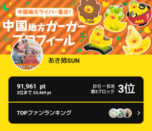 弊社所属ライバーのあき姉SUNがPococha主催イベント「中国地方ライバー集合!中国地方ガーガープロフィール」C1~C3の第3ブロックにて3位に入賞いたしました。