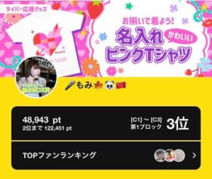 弊社所属ライバーのもみがPococha主催イベント「お揃いで着よう!名入れかわいいピンクTシャツ」C1~C3の第1ブロックにて3位に入賞いたしました。