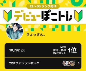 弊社所属ライバーのりょっさん。がPococha主催イベント「デビューぽこトレ」E1~D1の第6ブロックにて1位に入賞いたしました。
