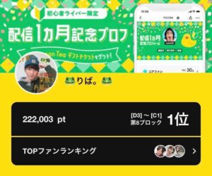 弊社所属ライバーのりば。がPococha主催イベント「配信1カ月おめでとう!全員もらえるチャンスありの記念プロフィール!」D3~C1の第8ブロックにて1位に入賞いたしました。