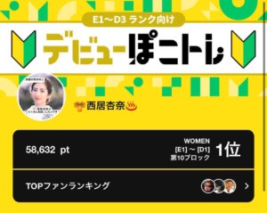 弊社所属ライバーの西居杏奈がPococha主催イベント「デビューぽこトレ」E1~D1の第10ブロックにて1位に入賞いたしました。