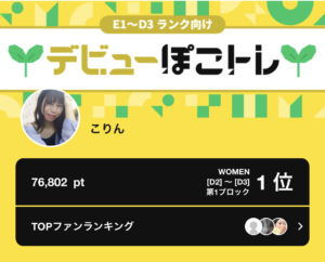 弊社所属ライバーのこりんがPococha主催イベント「デビューぽこトレ」D2~D3の第1ブロックにて1位に入賞いたしました。