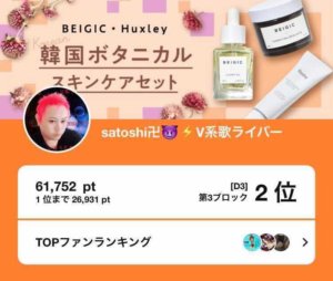 弊社所属ライバーのsatoshiがPococha主催イベント「BEIGIC・Huxley 韓国ボタニカルコスメセット」D3の第3ブロックにて2位に入賞いたしました。