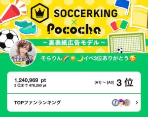 弊社所属ライバーのそらりんがPococha主催イベント「SOCCER KING x Pococha ~裏表紙 広告モデル~」A1~A3の部にて3位入賞いたしました。