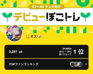 弊社所属ライバーのオズがPococha主催イベント「デビューぽこトレ~」E1~D1の第1ブロックにて1位入賞いたしました。