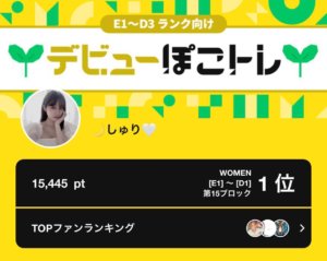弊社所属ライバーのしゅりがPococha主催イベント「デビューぽこトレ~」E1~D1の第15ブロックにて1位入賞いたしました。