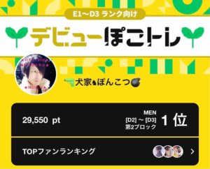 弊社所属ライバーの犬家♞ぽんこつがPococha主催イベント「デビューぽこトレ~」D2~D3の第2ブロックにて1位入賞いたしました。