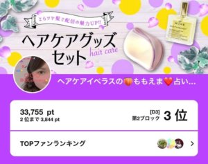 弊社所属ライバーのももえまがPococha主催イベント「好評!さらツヤ髪で配信の魅力UP!! ヘアケアグッズセット」D3の第2ブロックにて3位入賞いたしました。
