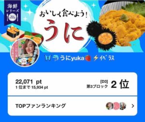 yuka、Pococha「海鮮シリーズ おいしく食べよう!うに」D3の第3ブロックにて2位入賞!