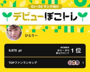 ひらりー、Pococha「デビューぽこトレ」E1~D1の第12ブロックにて1位入賞!
