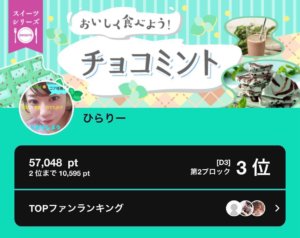 弊社所属ライバーのひらりーがPococha主催イベント「スイーツシリーズ おいしく食べよう!チョコミント」 D3の第2ブロックにて3位入賞いたしました。