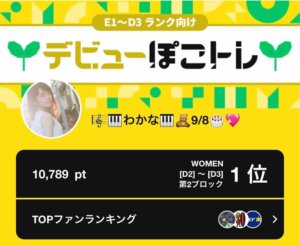 わかな、Pococha「デビューぽこトレ」D2~D3の第2ブロックにて1位入賞!