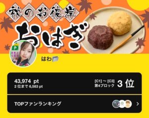 弊社所属ライバーのはわがPococha主催イベント「秋のお彼岸 おはぎ」 C1~C3の第4ブロックにて3位入賞いたしました。