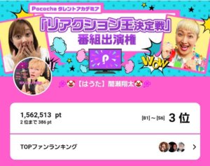 弊社所属ライバーの間瀬翔太がPococha主催イベント「Pocochaタレントアカデミア『リアクション王決定戦』番組出演権」 S1~S6の部にて3位入賞いたしました。