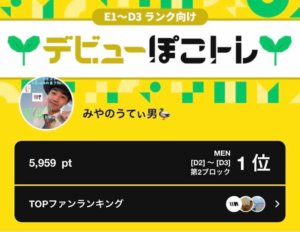 弊社所属ライバーのみやのうてぃ男がPococha主催イベント「デビューぽこトレ」D2~D3の第2ブロックにて1位入賞いたしました。