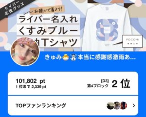弊社所属ライバーのきゅみがPococha主催イベント「お揃いで着よう!ライバー名入れくすみブルー長袖Tシャツ」D3の第4ブロックにて2位入賞いたしました。