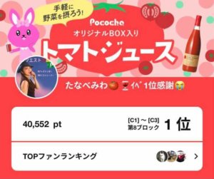 弊社所属ライバーのたなべみわがPococha主催イベント「手軽に野菜を摂ろう!PocochaオリジナルBOX入りトマトジュース」C1~C3の第8ブロックにて1位入賞いたしました。