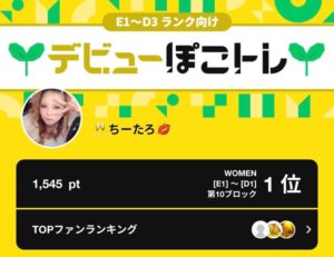 ちーたろ、Pococha「デビューぽこトレ」E1~D1の第10ブロックにて1位入賞!
