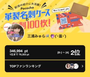 なつみ「寝坊、配信見逃しはこれで解消!めざましポコ時計」A+~S+優勝!三浦みゅら「配信の紹介に大活躍!Pococha革製名刺ケース&オリジナル名刺100枚!」B-~A 2位入賞!