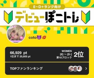 弊社所属ライバーのcotoがPococha主催イベント「デビューぽこトレ」E~D-第10ブロックにて2位に入賞いたしました。