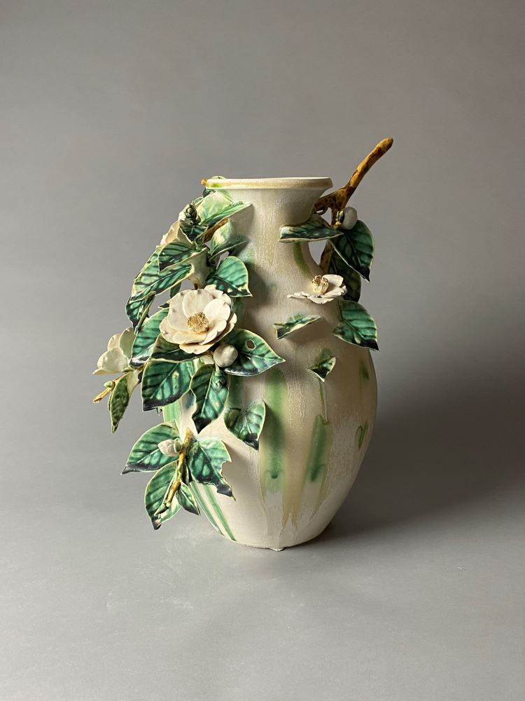 使用される事を前提とした「器」という形を取りながらも、使わずに飾る為だけに作られた「器」に興味を持ち制作しています。使用には適さないほど過剰な装飾が施された壷などです。