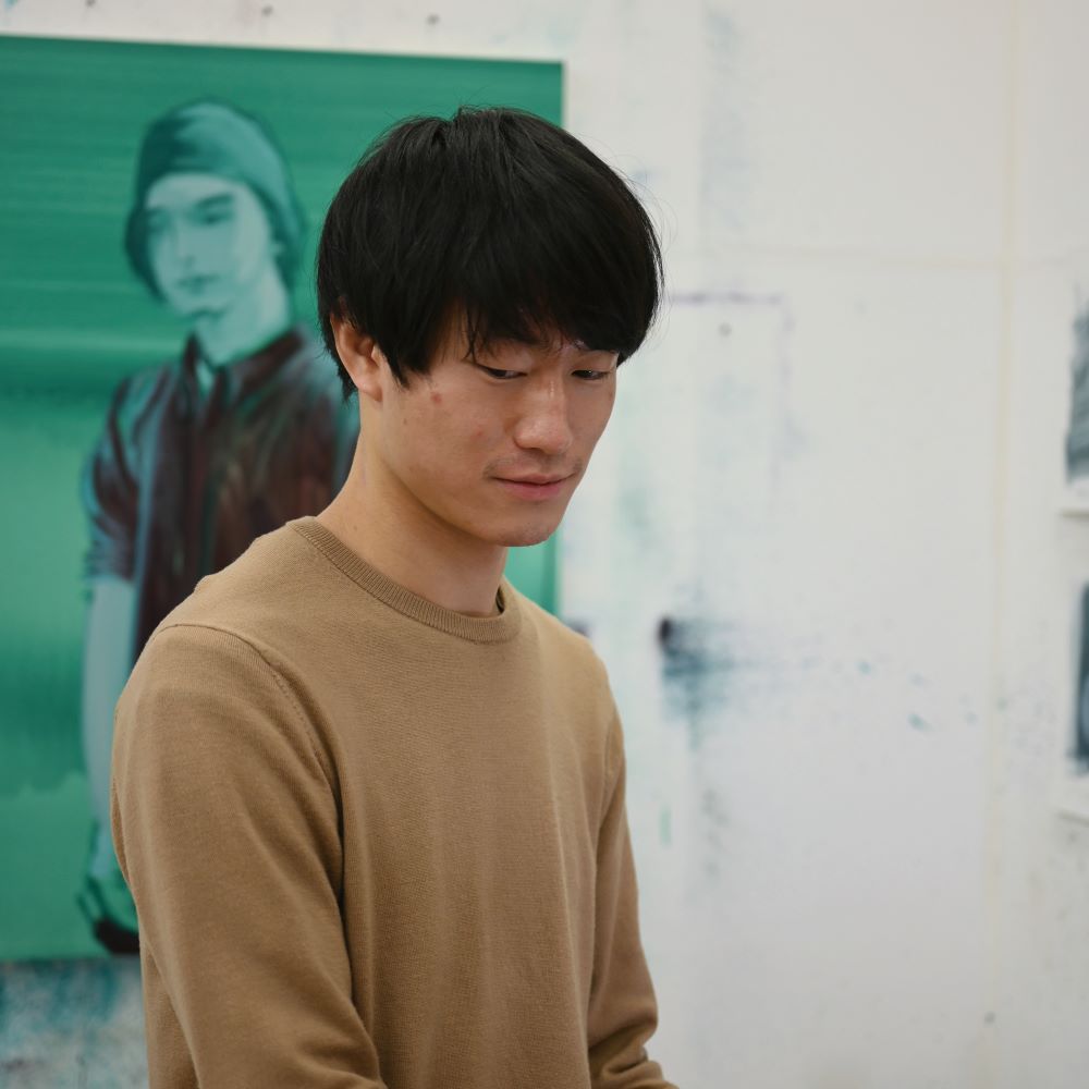 為と絵画を描く行為を重ね、イメージをキャンバスと自身へ交互に行き来させるように、色彩、質