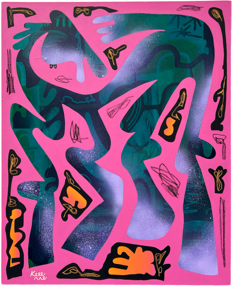 ペインティングを中心に、立体、コラージュやデジタルライブペインティングなど、媒体や形式を横断する多彩な表現で活動を展開するアーティスト。「Keeenue(キーニュ)」は、本名KANAのカタカナ読み(ケーエーエヌエー)に由来する造語。