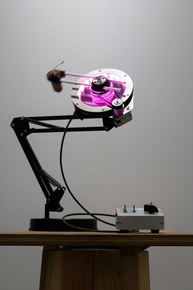 私は、物体と万有引⼒の関係に着⽬し、彫刻という⾏為を通してその「なにか」へと介⼊しようとしている。それは、形として定着することはなくとも、世界に確かな歪みや余韻をもたらす⼒として現れるものだと捉えている。
