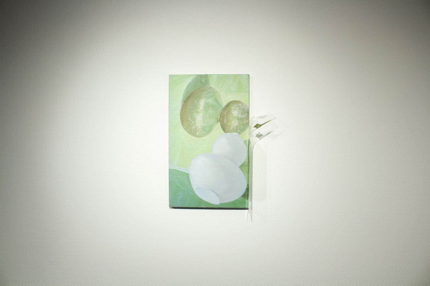 表現を成立させるための物質的な支持体として、透明なアクリル板を用いています。クリアな支持体は薄く伸ばした絵の具に光を透過させ、湾曲した面は描かれたイメージをより軽やかにします。