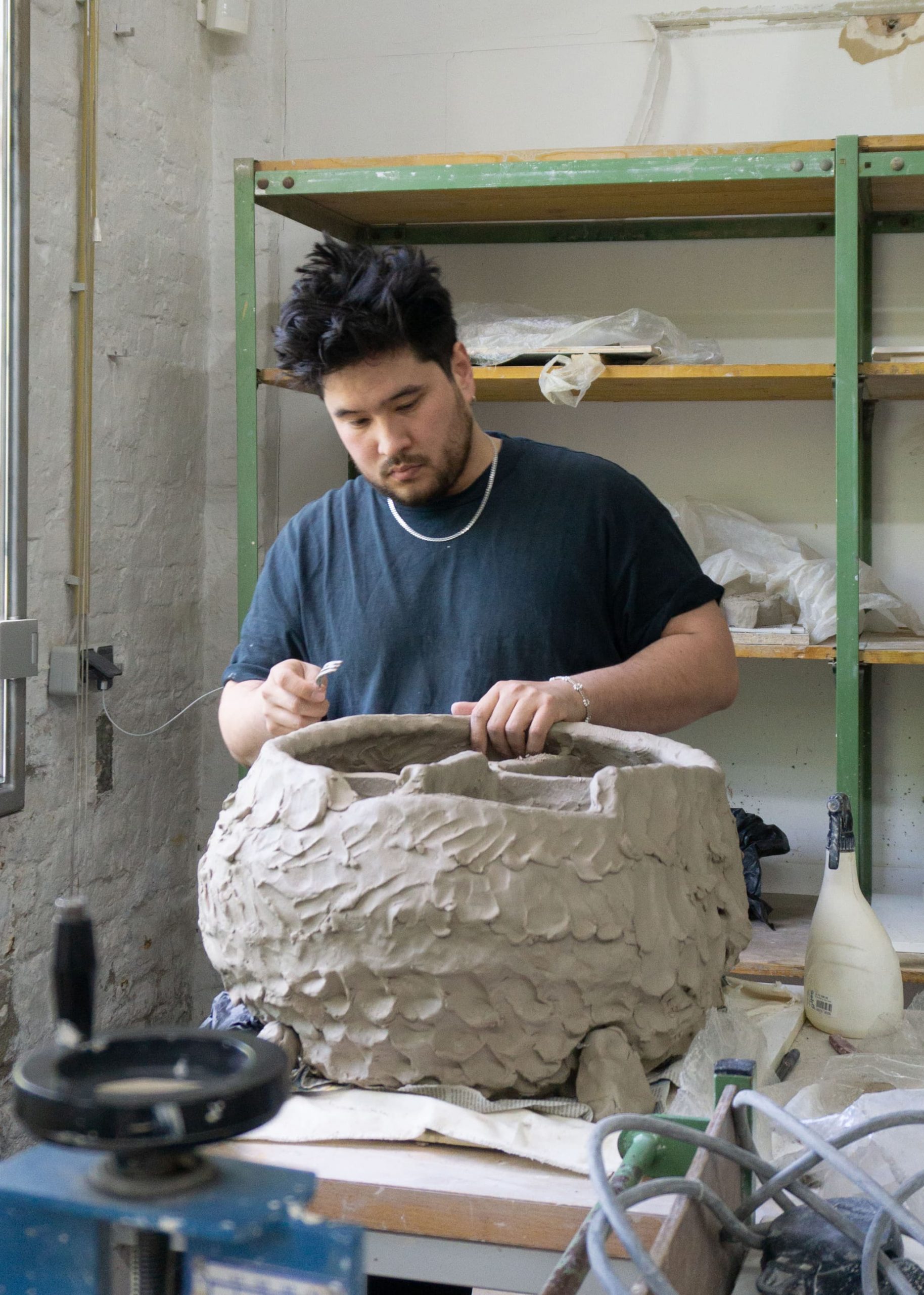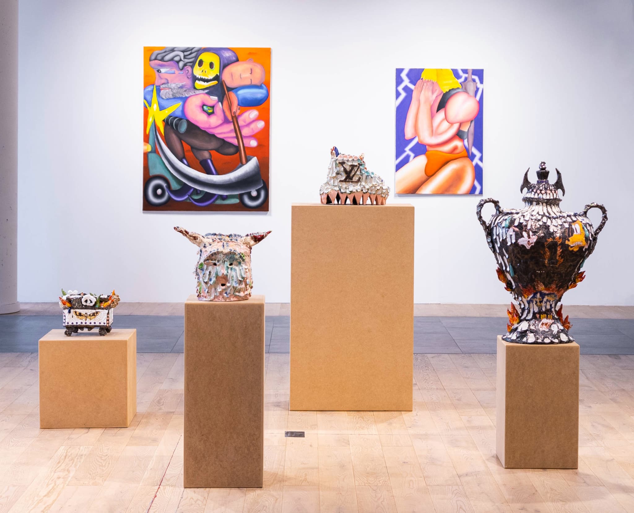 絵画とセラミックを融合させた学際的な制作を行い、ポップカルチャーや政治的な要素を強く取り入れることが多い。
