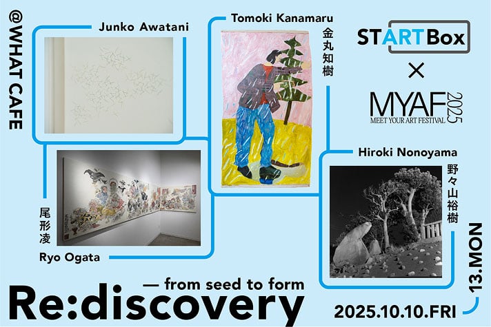 本展は、MEET YOUR ART FESTIVAL 2025のテーマ「再発見(Rediscovery)」を出発点に、若手アーティストの創造と発信、そしてキャリアの始まりを支援するSTART Boxで活動してきたJunko Awatani、尾形凌、金丸知樹、野々山裕樹の4名とともに構成される展覧会です。