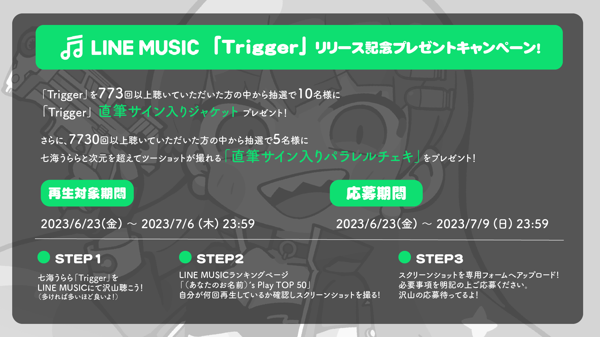 2023/6/23(金)に配信スタートの七海うらら『Trigger』をLINE MUSICにて期間中に 773回以上聴いていただいた方の中から抽選で10名様に「Trigger 直筆サイン入りジャケット」をプレゼント。