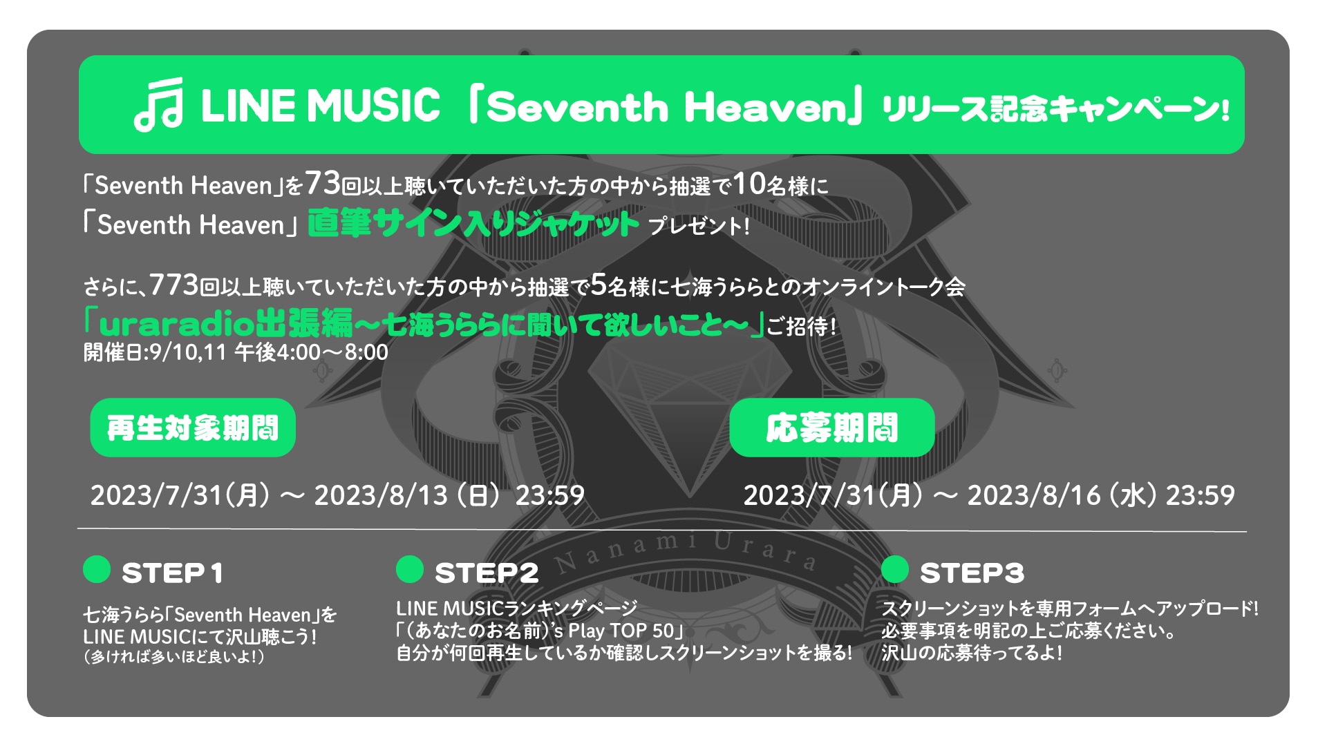 2023/7/31(月)に配信スタートの七海うらら「Seventh Heaven」をLINE MUSICにて期間中に 73回以上聴いていただいた方の中から抽選で10名様に「Seventh Heaven 直筆サイン入りジャケット」をプレゼント。