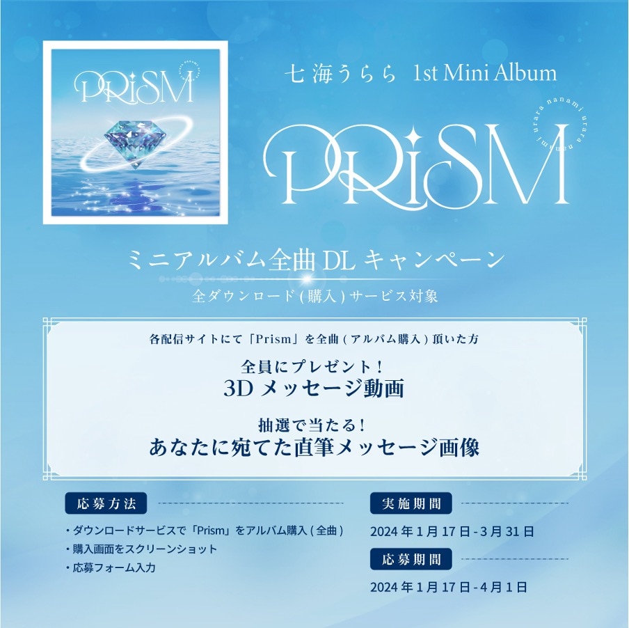 七海うらら 1st Mini Album「Prism」を全ダウンロードサービスにて期間中にアルバム購入(全曲)していただいた方の中から全員に3Dメッセージ動画をプレゼント!