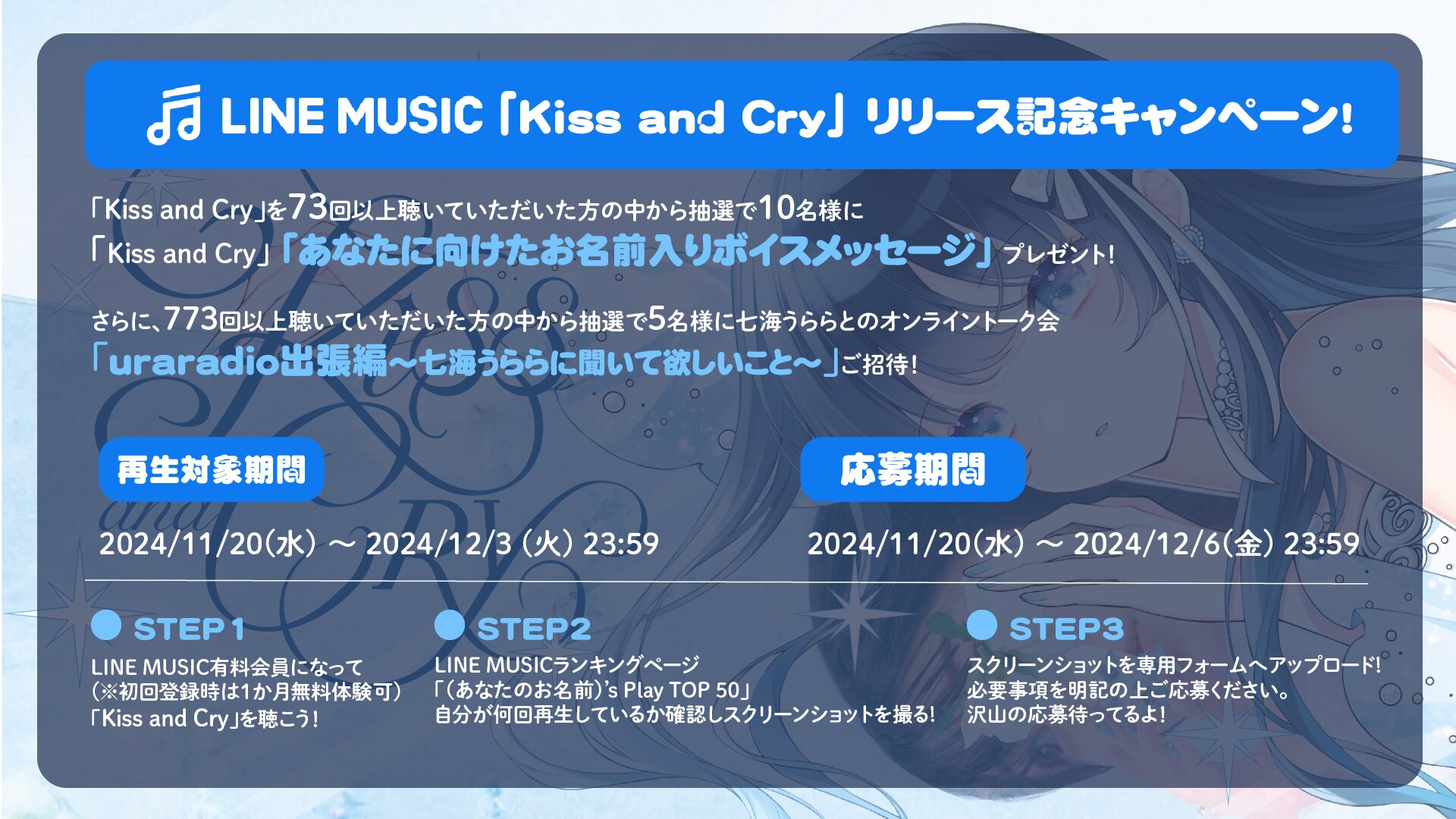 七海うらら「Kiss and Cry」をLINE MUSICにて期間中に 73回以上聴いていただいた方の中から抽選で10名様に「 あなたに向けたお名前入りボイスメッセージ」をプレゼント。さらに、773回以上聴いていただいた方の中から抽選で5名様に七海うららとオンラインでトークが出来る「uraradio出張編~七海うららに聞いて欲しいこと~」にご招待!再生回数が多い方ほど当選確率が高くなります!
