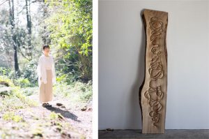 会場では、主に麻を使用した一点物の衣服を生み出すファッションブランド CHNEIDERの作品と、木という存在に寄り添い続ける彫刻家・髙山端の作品が、同じ空間で共存します。