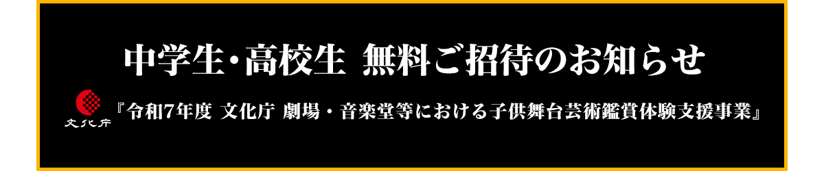 ※本公演の主催およびそれに準ずる団体、文化庁および文化庁「劇場・音楽堂等における子供舞台芸術鑑賞体験支援事業」事務局に対し、「令和7年度 文化庁劇場・音楽堂等における子供舞台芸術鑑賞体験支援事業」の報告の為にお客様の個人情報の一部(氏名、生年月日)を開示・提出させていただきます。